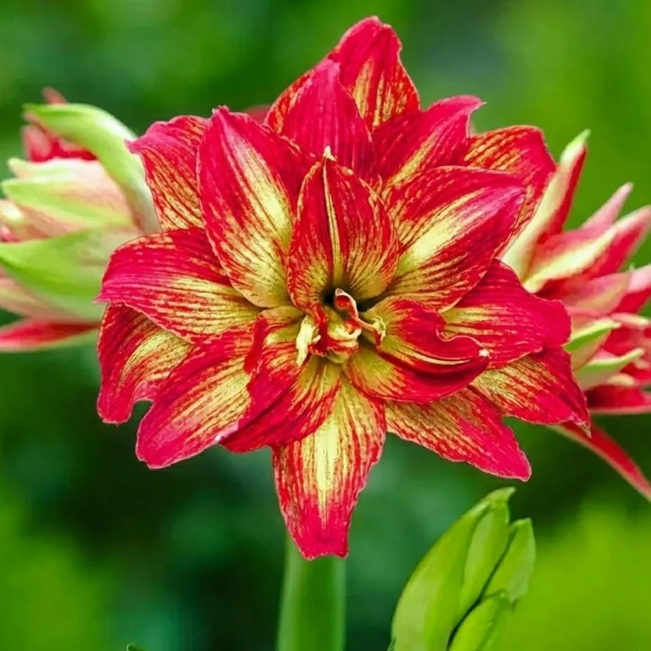 Culoarea: Baza este un roșu aprins, plin de viață. Specificul acestui soi sunt striațiile neregulate, de culoare galben-crem și verde deschis, care pornesc din centrul florii și se ramifică spre margini. Aceste dungi nu sunt uniforme, ci par a fi pictate rapid, sugerând mișcarea, artificiile sau panglicile colorate.