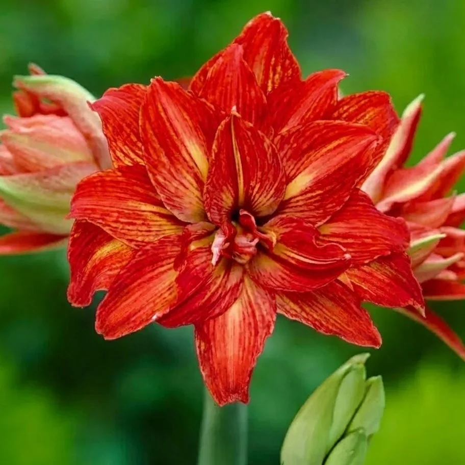 Un amaryllis dublu, incendiar, care aduce energia focului direct în casa ta. Cu petale stratificate într-un roșu-stacojiu intens, străbătute de striații aurii și albe, "Inferno" pare o explozie florală incandescentă, emanând pasiune și vitalitate.