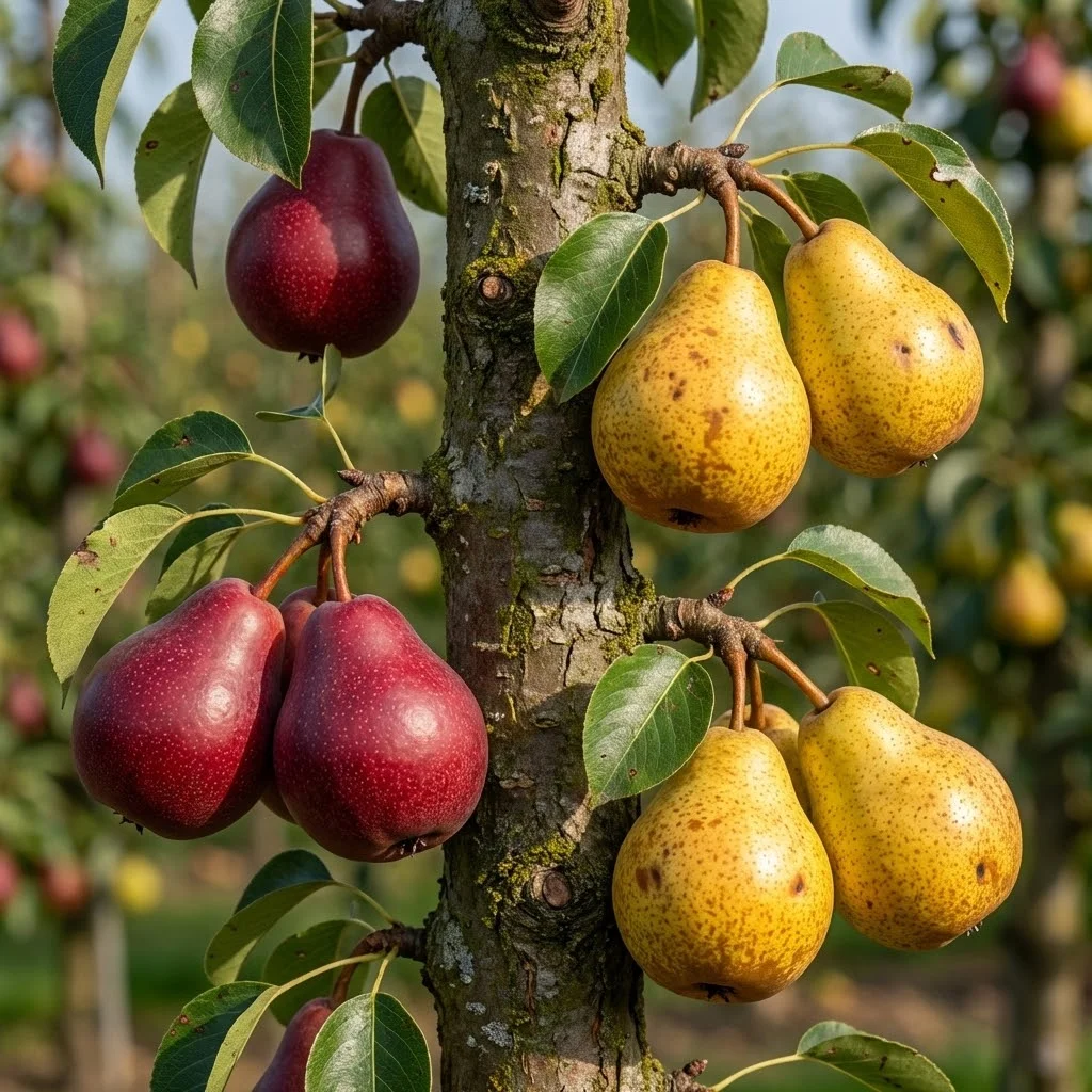 Habitus și Structură Așa cum se vede în imaginea realistă, pomul are un trunchi robust, cu o scoarță crăpată specifică perului matur, ceea ce îi conferă rezistență. Ramurile de rod sunt scurte (țepușe), iar fructele atârnă greu, susținute de codițe lemnoase și puternice. Frunzele sunt lucioase, de un verde închis, sănătos.