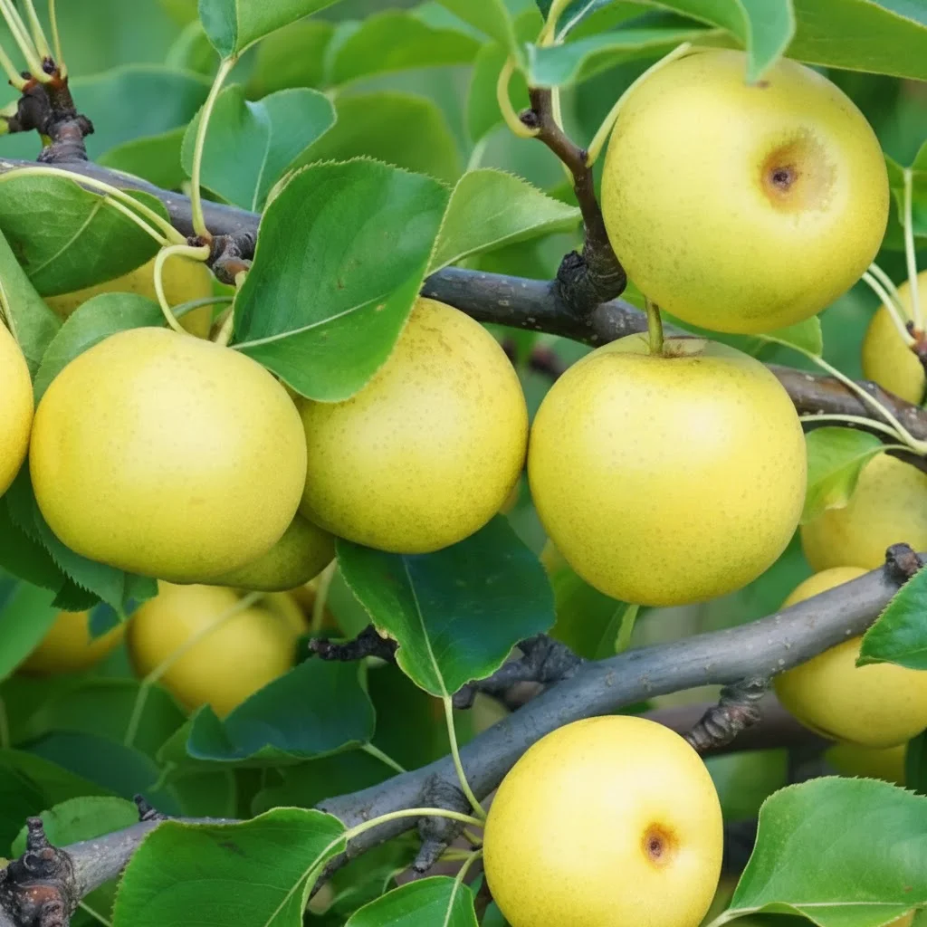 Caracteristicile Fructului: Fructele sunt rotunde sau ușor turtite, asemănătoare ca formă cu merele. Coaja este subțire, adesea punctată cu mici lenticele (puncte maronii), având culori de la galben-pai până la bronz-auriu. Pulpa este albă, extrem de zemoasă, dulce și parfumată, având o textură granulară foarte fină.