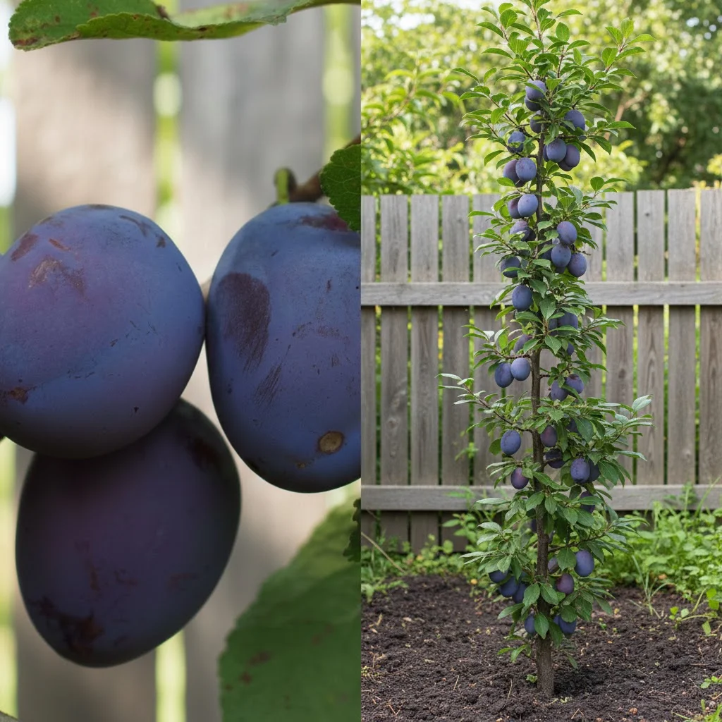 Port și Formă: Prunul Centenar columnar se distinge printr-o creștere verticală, asemănătoare unei coloane. Ramurile laterale sunt foarte scurte, iar mugurii fructiferi se formează preponderent pe tulpina principală și pe aceste ramificații scurte. Această formă compactă face ca pomul să nu depășească, de obicei, 2.5-3 metri în înălțime și doar 60-80 cm în lățime, fiind perfect pentru a crea un "gard viu fructifer" sau pentru a fi plantat individual.