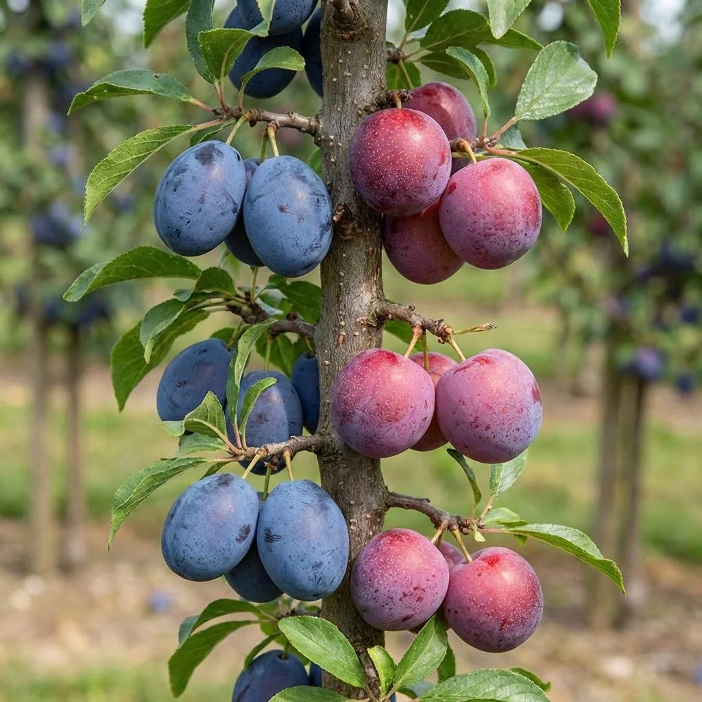 Acest pom este "fabrica de conserve și desert" a grădinii tale. Reunește pe o singură tulpină verticală soiul clasic internațional Stanley, celebru pentru versatilitatea sa (ideal pentru magiun și uscare), cu soiul Delicios, o prună de masă extrem de dulce, zemoasă și aromată. Este soluția perfectă pentru a obține două tipuri distincte de prune fără a sacrifica spațiul din grădină.