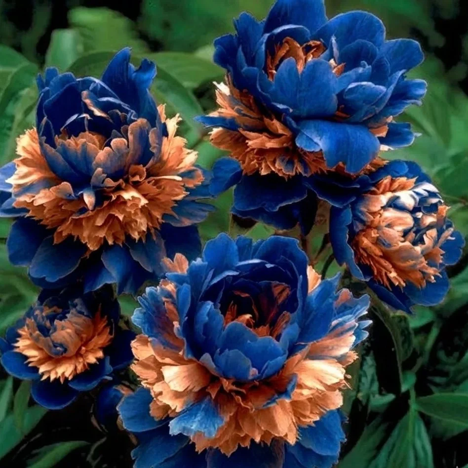 Acest soi se remarcă prin flori mari, bogate, de tip dublu sau semi-dublu. Petalele exterioare sunt largi, ușor ondulate și au o textură catifelată, având o culoare profundă și intensă de albastru safir sau indigo, o nuanță extrem de rară în paleta obișnuită a bujorilor. Spectacolul vizual este desăvârșit de centrul florii. Aici, o aglomerare densă de petaloide și stamine modificate explodează într-o culoare contrastantă caldă: nuanțe vibrante de portocaliu-arămiu, piersică coaptă și accente aurii.