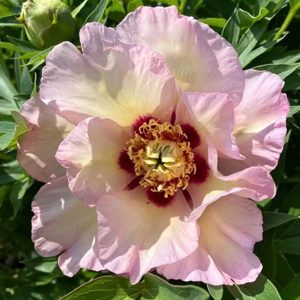 Bujorul Pastel Splendour se remarcă prin frunzele sale compuse, având o structură deosebită, care adaugă un aspect elegant grădinii tale. Florile mari, cu petale numeroase, sunt un adevărat spectacol vizual, având un centru bogat în stamine și carpeli.