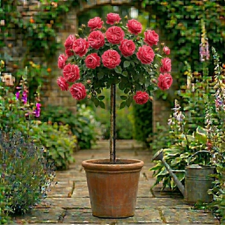 Trandafirul „Coral” în formă de pomișor clasic este definiția bucuriei vizuale. Așa cum reiese din imaginea de referință, acest soi dezvoltă o coroană densă, sferică, susținută de un trunchi vertical solid, oferind o prezență sculpturală impresionantă.