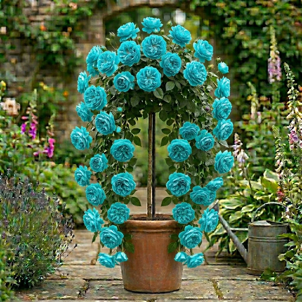 Flori și Culoare: Aceasta este elementul magic. Produce flori mari, duble, involte. Culoarea este o nuanță intensă și vibrantă de turcoaz, o combinație uluitoare de albastru și verde, care evocă mările tropicale și pietrele prețioase. Este un trandafir care stârnește uimire și discuții, fiind ideal pentru a crea un punct focal neașteptat.
