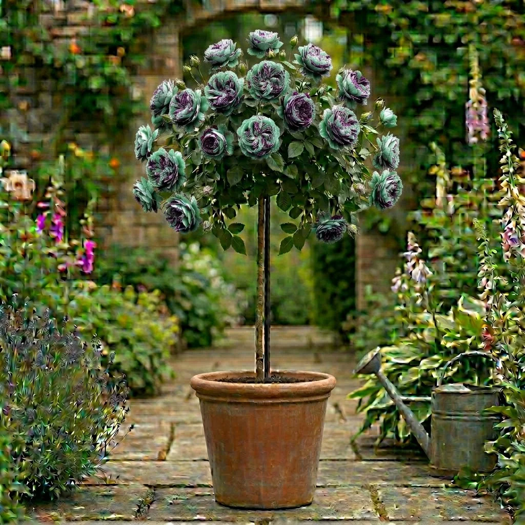 Trandafirul „Emerald Twilight” este o operă de artă vie. Forma sa de pomișor clasic pune în valoare contrastul ireal dintre petalele exterioare verzi, ca mușchiul de pădure, și centrul intens, de un purpuriu adânc. Imaginea de referință surprinde perfect echilibrul coroanei sferice pe trunchiul drept, oferind o geometrie ideală pentru orice aranjament peisagistic.
