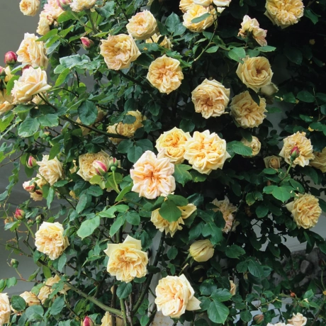 Florile: Sunt mari, extrem de bogate în petale, cu un aspect ușor „dezordonat” și romantic. Culoarea este fascinantă: un amestec subtil de galben-crem, caisă și reflexii de somon, care par să strălucească în lumina amurgului.