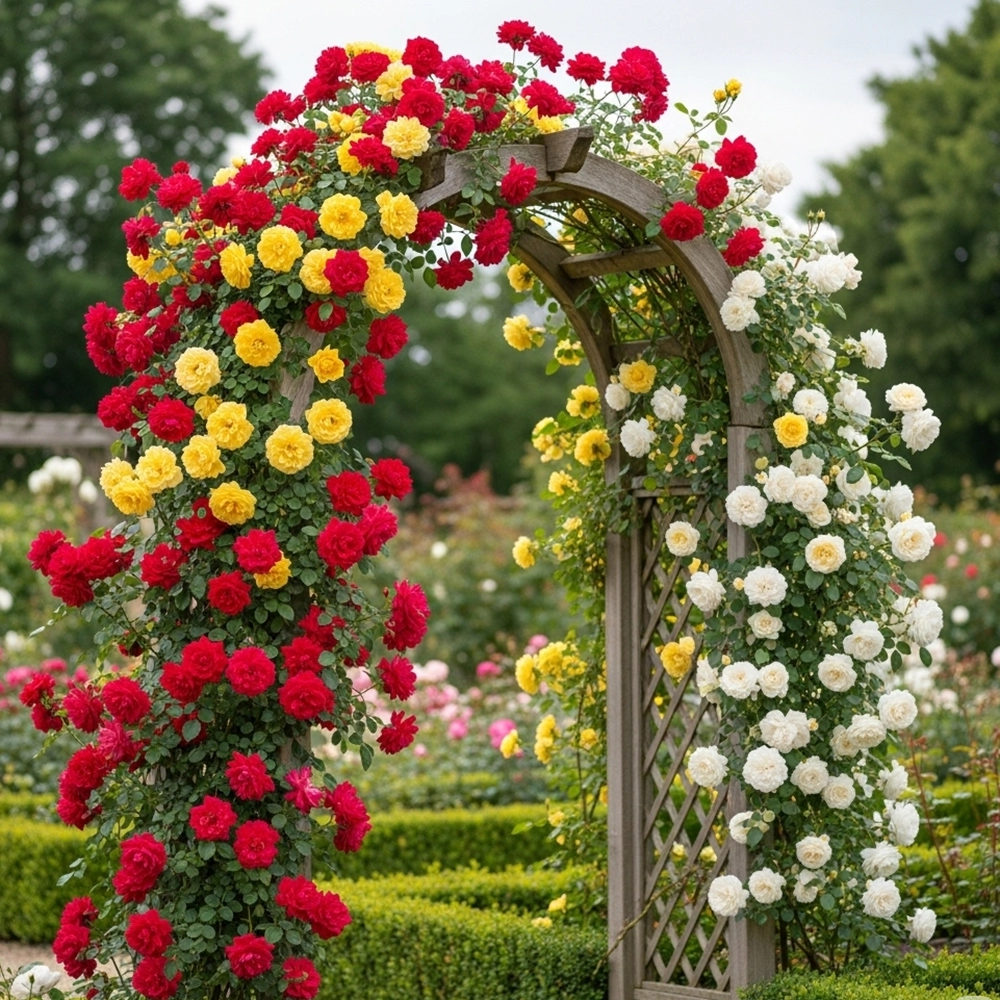 Trandafirul urcator Multicolor ofera o combinatie spectaculoasa de culori, ideal pentru a adauga viata si culoare oricarui spatiu. Cu trei altoiuri, aceasta planta este o alegere perfecta pentru gradini.