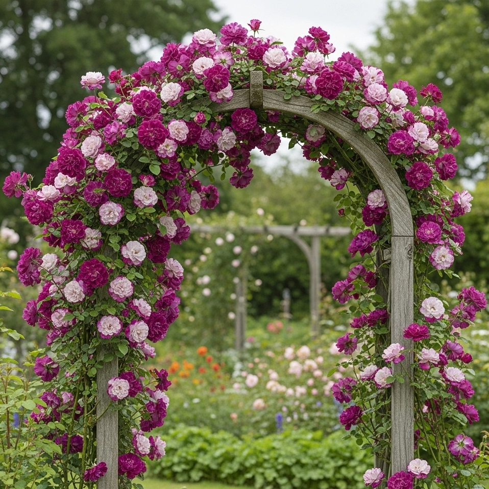 Trandafirul urcător multicolor este perfect pentru a da viață grădinii tale. Cu flori în nuanțe de mov închis și alb, acest trandafir va adăuga un strop de culoare și eleganță.