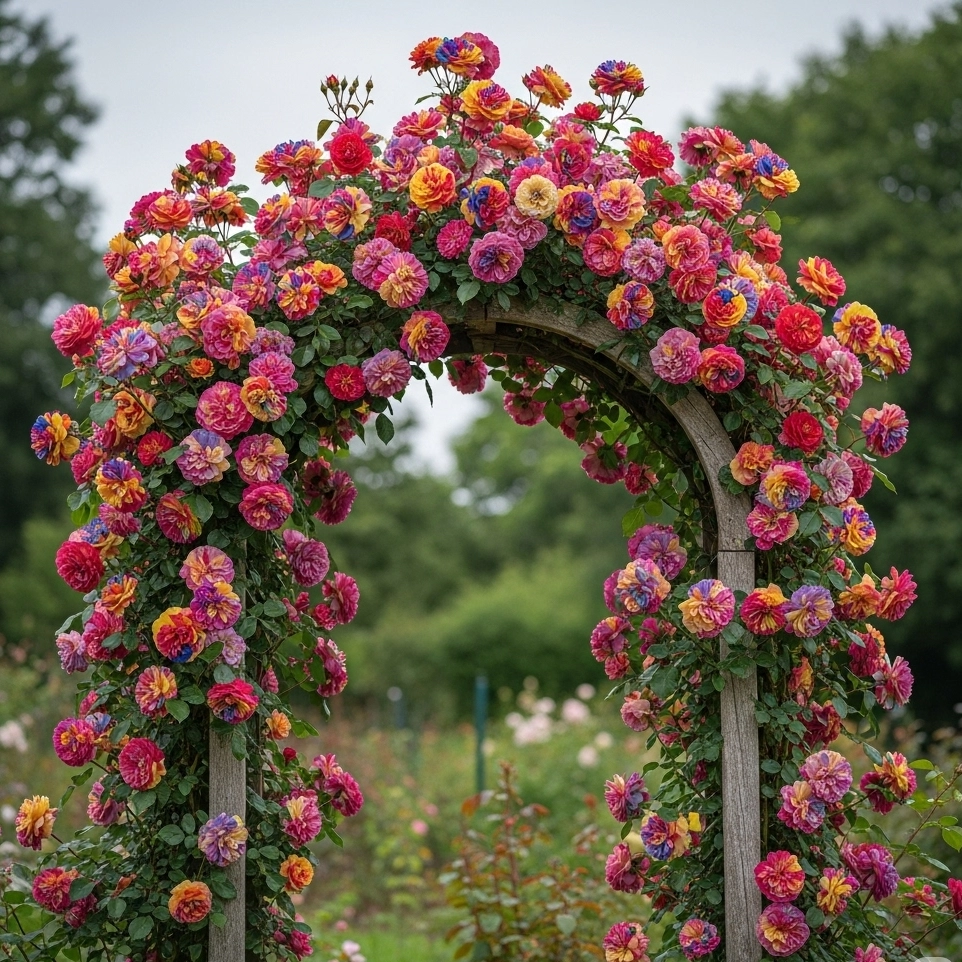 Trandafirul Urcator Rainbow este o planta ornamentala spectaculoasa, crescand rapid si avand flori impresionante. Ideal pentru a adauga culoare si eleganta in gradina ta.