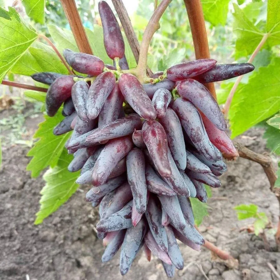 Aspectul fructului: Boabele sunt extrem de lungi, subțiri și curbate, terminându-se într-un vârf ascuțit. Această formă tubulară și neregulată le face să semene cu niște „degete” sau mici ardei iuți. Culoarea este de un negru-violet intens, cu un strat fin de pruină (ceara naturală a strugurelui) care le dă un aspect mat, elegant.